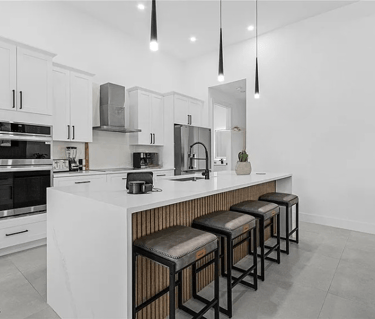 Step inside to a grand foyer leading into an open-concept living area with soaring tray ceilings and ceramic tile floors throughout. A striking fireplace wall with wood surround anchors the living space, while the chef’s kitchen is a true centerpiece, complete with a waterfall quartz island, white wood cabinetry, high-end stainless steel appliances, hideaway outlets, and integrated phone chargers.
