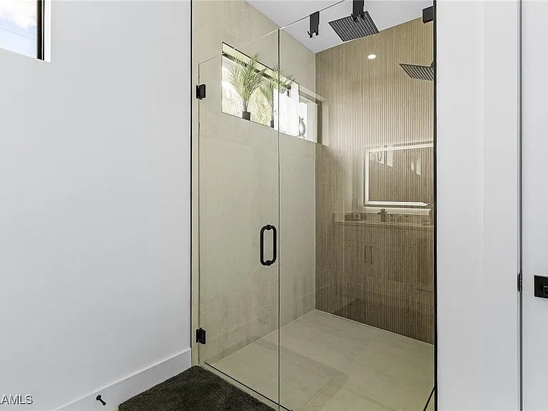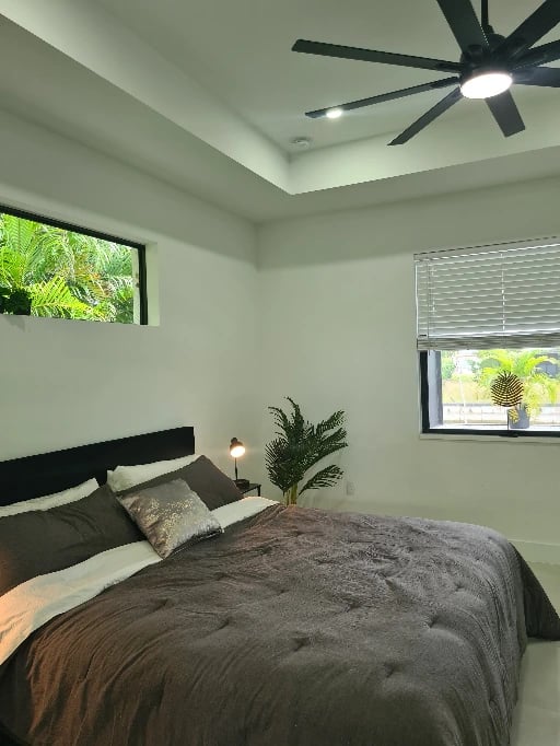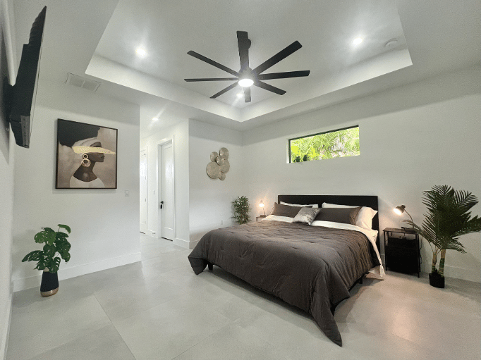 Die Hauptsuite besticht durch ein komfortables Kingsize-Bett mit stilvollen Nachttischen mit LED-Beleuchtung und praktischen USB-Ladeanschlüssen, einen Fernseher, einen großzügigen begehbaren Kleiderschrank sowie ein privates, geräumiges Badezimmer mit modernem Design und einer luxuriösen Dusche. Von der Suite aus blicken Sie auf den Poolbereich.