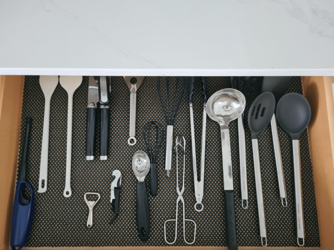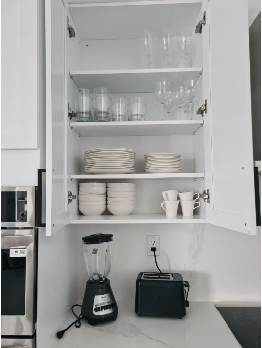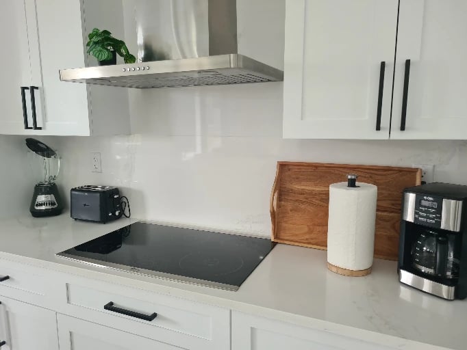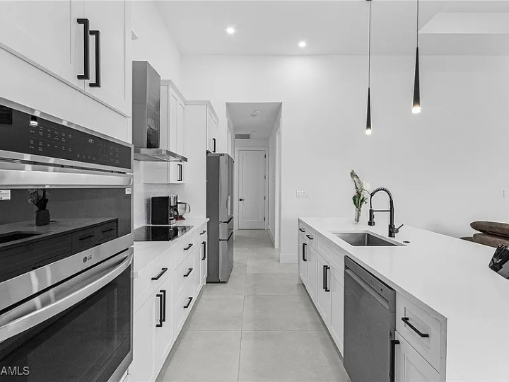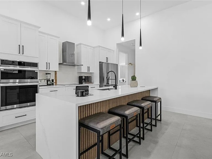 Modern, fully equipped kitchen with oven, microwave, side-by-side fridge with ice dispenser, coffee maker, blender, toaster, and breakfast bar featuring garbage disposal in the sink plus recessed USB and induction charging ports.
