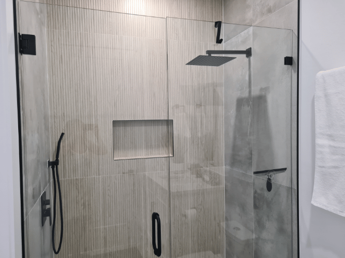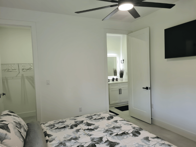 This elegant bedroom impresses with a comfortable German double bed measuring 2 x 2 meters (roughly kingsize), stylish nightstands featuring LED lighting and practical USB charging ports, a spacious walk-in closet, and a TV. The appealing modern bathroom delights with its high level of comfort.