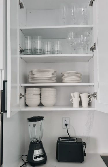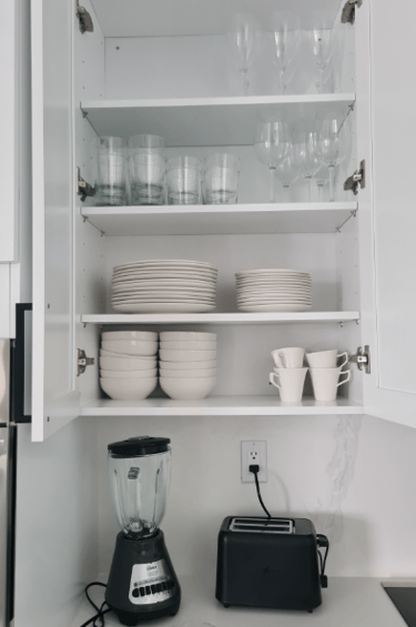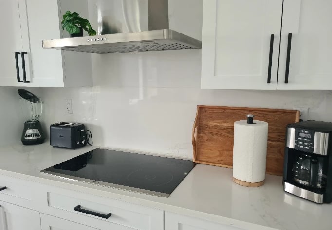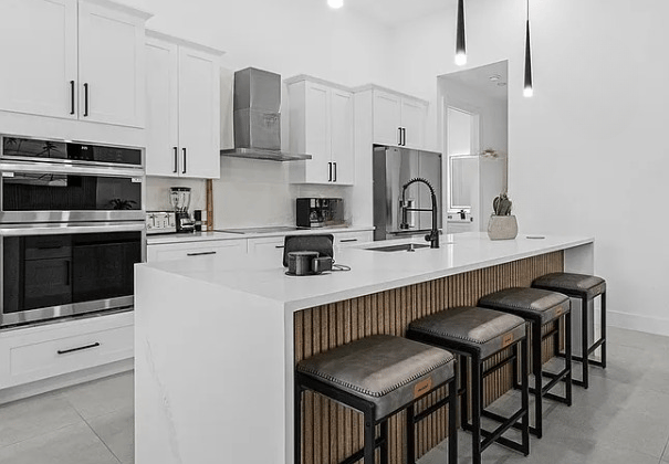Modern, fully equipped kitchen with oven, microwave, side-by-side fridge with ice dispenser, coffee maker, blender, toaster, and breakfast bar featuring garbage disposal in the sink plus recessed USB and induction charging ports.