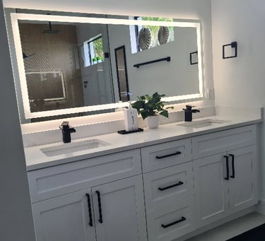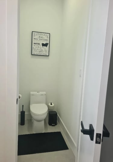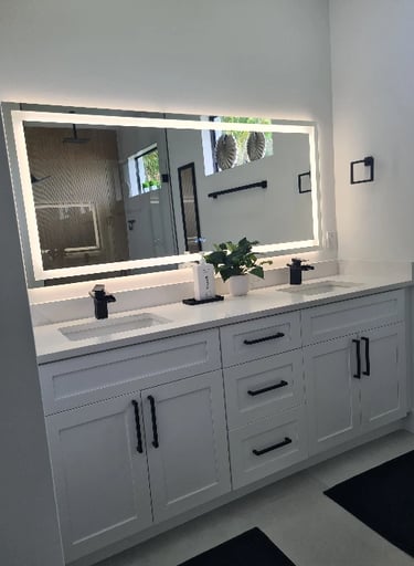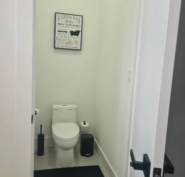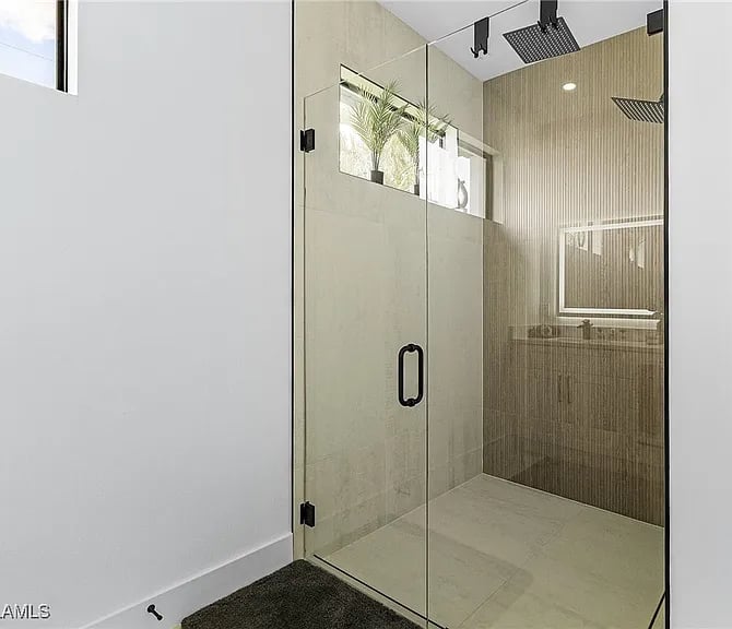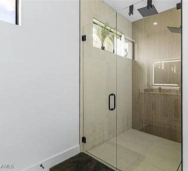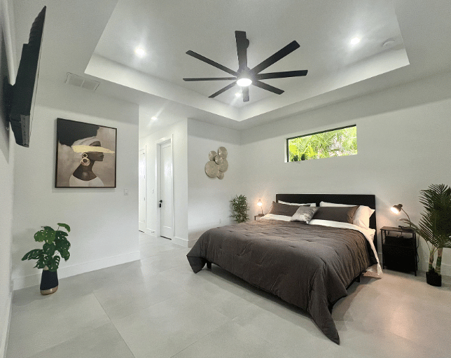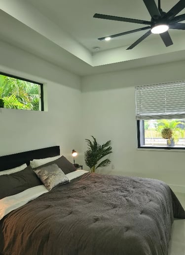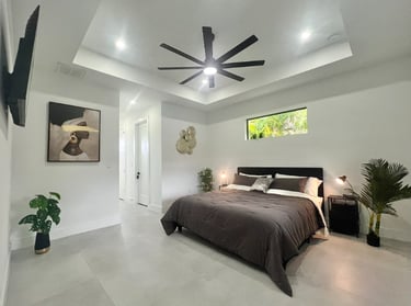 The master suite features a comfortable king-size bed with stylish nightstands equipped with LED lighting and convenient USB charging ports, a TV, a spacious walk-in closet, and a private, modern bathroom with a luxurious shower. From the suite, you can enjoy views of the pool area.