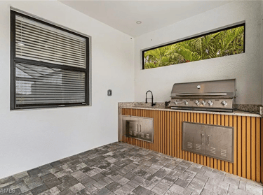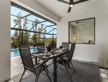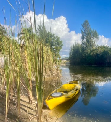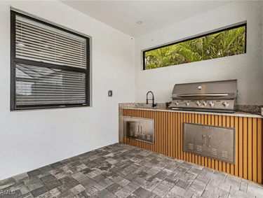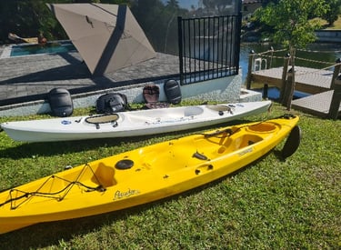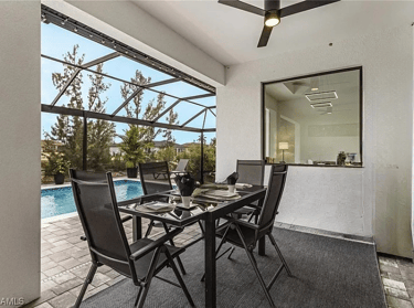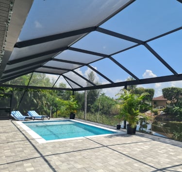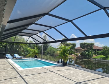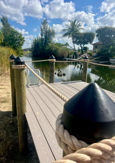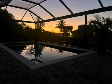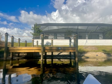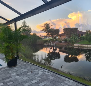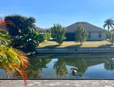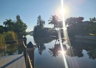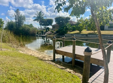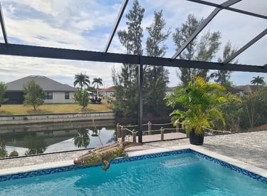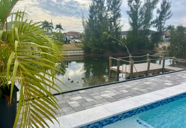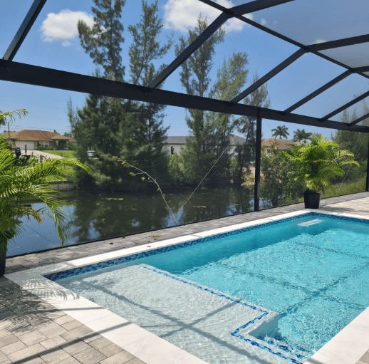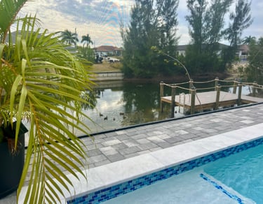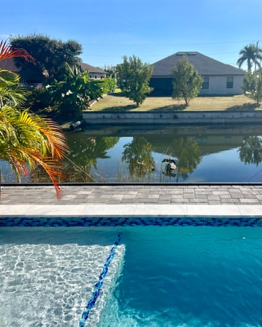 The pool area faces south and is located along a quiet freshwater canal.