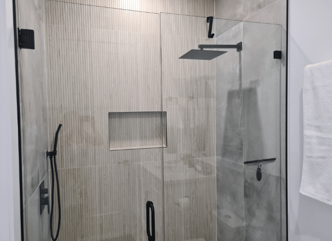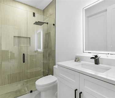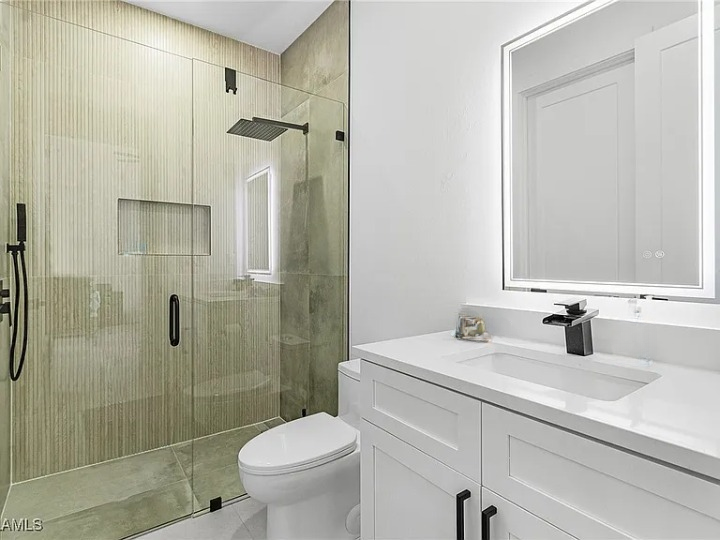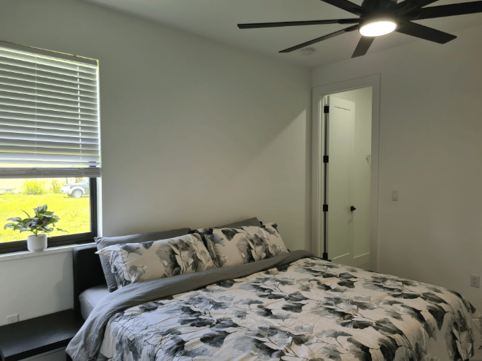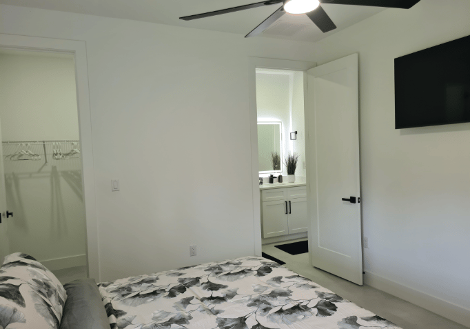 This elegant bedroom impresses with a comfortable German double bed measuring 2 x 2 meters (roughly kingsize), stylish nightstands featuring LED lighting and practical USB charging ports, a spacious walk-in closet, and a TV. The appealing modern bathroom delights with its high level of comfort.